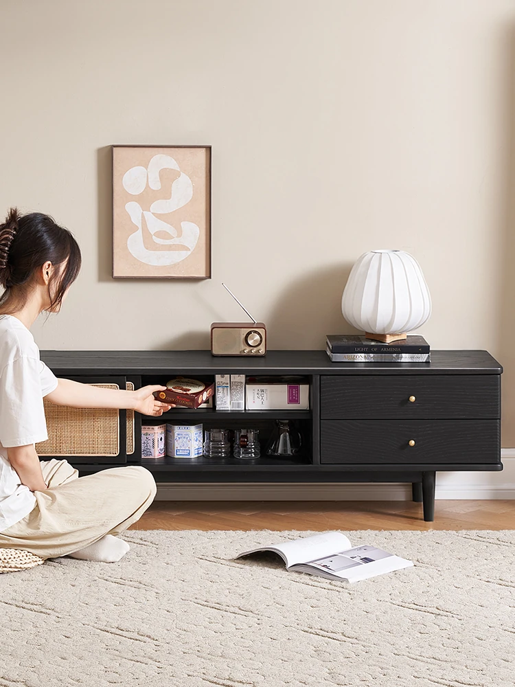 オリジナルエレメント無垢材テレビサイドキャビネット - 北欧スタイルオーク収納キャビネット、モダンミニマリストデザイン、リビングにぴったりなラタン製収納ボックス H6101 - デザイン性と機能性を兼ね備えたアイテム。