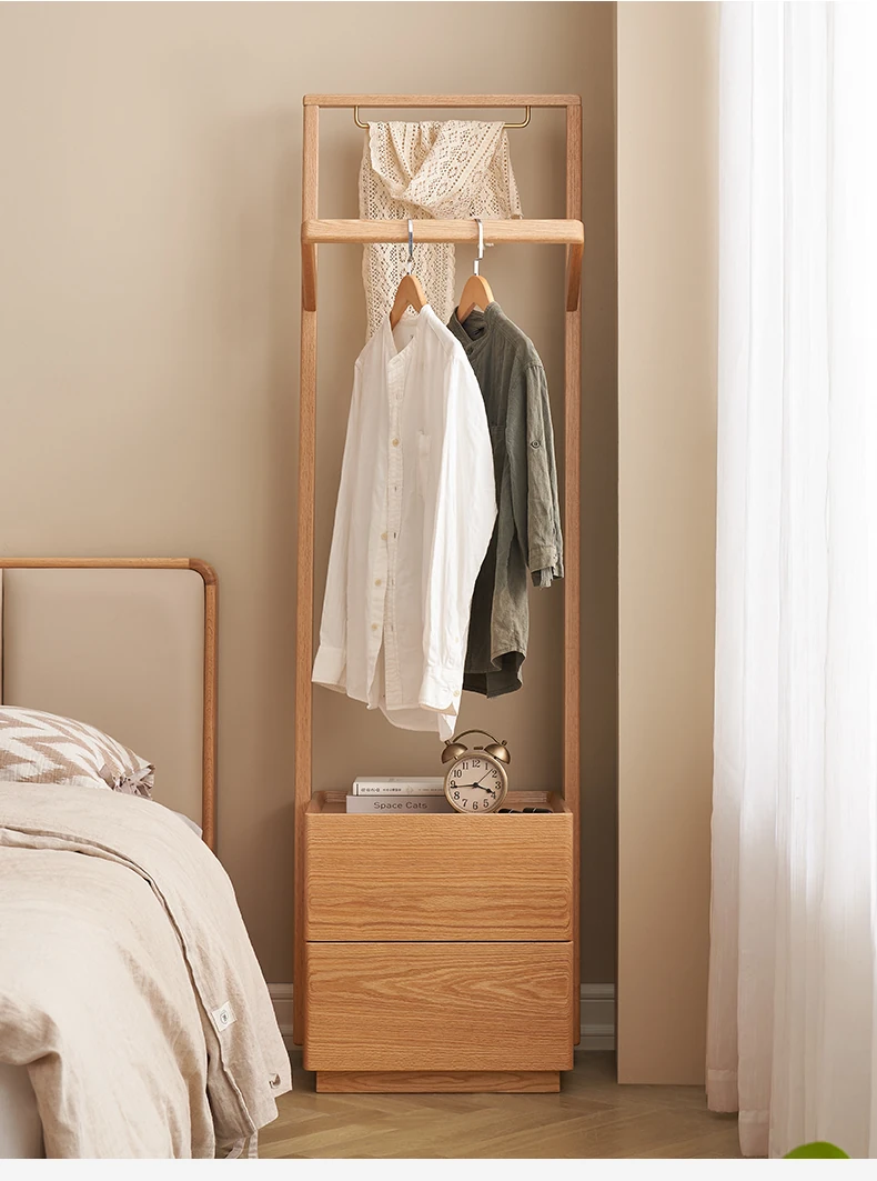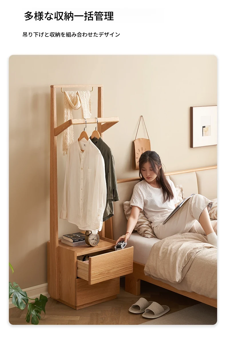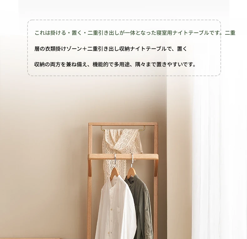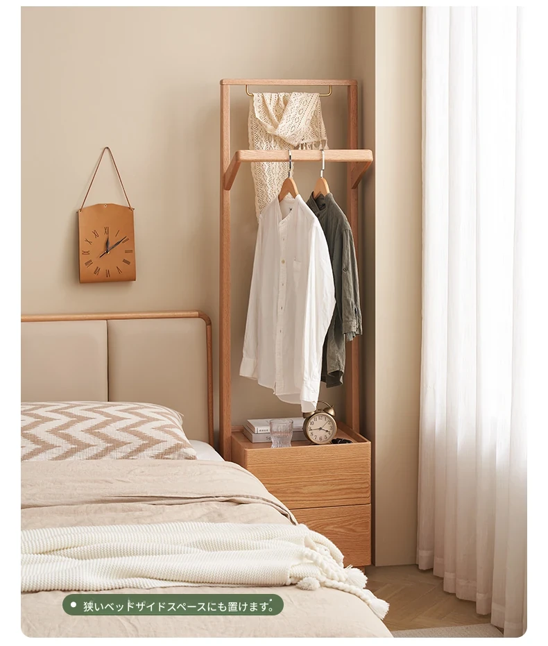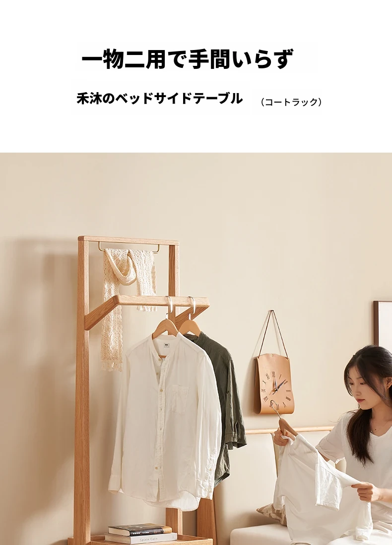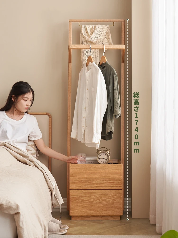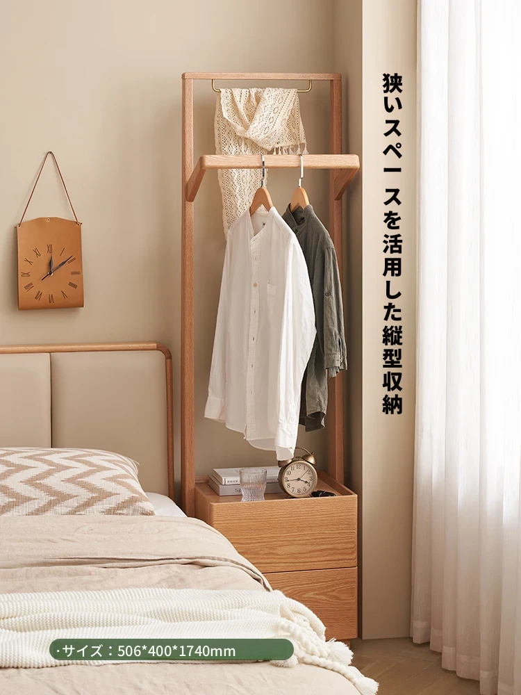 オリジナル素朴な全木製ベッドサイドテーブル|モダンミニマリズムデザイン|オーク材の耐久性とスタイルを両立|多機能コートスタンドと収納ラックL7026で、あなたの空間に洗練を。